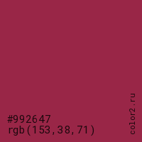 Цвет #992647 в цветовой модели RGB обозначается тремя октетами (153, 38, 71) в десятичном формате и #992647 в шестнадцатиричном (hex) формате, которые являются интенсивностью красного 153 (hex 99), интенсивность зелёного 38 (hex 26) и интенсивность синего 71 (hex 47).