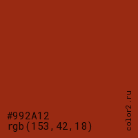 Цвет #992A12 в цветовой модели RGB обозначается тремя октетами (153, 42, 18) в десятичном формате и #992A12 в шестнадцатиричном (hex) формате, которые являются интенсивностью красного 153 (hex 99), интенсивность зелёного 42 (hex 2A) и интенсивность синего 18 (hex 12).