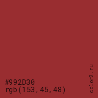 Цвет #992D30 в цветовой модели RGB обозначается тремя октетами (153, 45, 48) в десятичном формате и #992D30 в шестнадцатиричном (hex) формате, которые являются интенсивностью красного 153 (hex 99), интенсивность зелёного 45 (hex 2D) и интенсивность синего 48 (hex 30).
