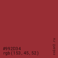 Цвет #992D34 в цветовой модели RGB обозначается тремя октетами (153, 45, 52) в десятичном формате и #992D34 в шестнадцатиричном (hex) формате, которые являются интенсивностью красного 153 (hex 99), интенсивность зелёного 45 (hex 2D) и интенсивность синего 52 (hex 34).