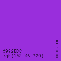 Цвет #992EDC в цветовой модели RGB обозначается тремя октетами (153, 46, 220) в десятичном формате и #992EDC в шестнадцатиричном (hex) формате, которые являются интенсивностью красного 153 (hex 99), интенсивность зелёного 46 (hex 2E) и интенсивность синего 220 (hex DC).