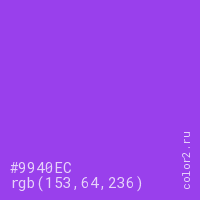 Цвет #9940EC в цветовой модели RGB обозначается тремя октетами (153, 64, 236) в десятичном формате и #9940EC в шестнадцатиричном (hex) формате, которые являются интенсивностью красного 153 (hex 99), интенсивность зелёного 64 (hex 40) и интенсивность синего 236 (hex EC).