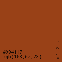 Цвет #994117 в цветовой модели RGB обозначается тремя октетами (153, 65, 23) в десятичном формате и #994117 в шестнадцатиричном (hex) формате, которые являются интенсивностью красного 153 (hex 99), интенсивность зелёного 65 (hex 41) и интенсивность синего 23 (hex 17).