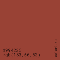 Цвет #994235 в цветовой модели RGB обозначается тремя октетами (153, 66, 53) в десятичном формате и #994235 в шестнадцатиричном (hex) формате, которые являются интенсивностью красного 153 (hex 99), интенсивность зелёного 66 (hex 42) и интенсивность синего 53 (hex 35).
