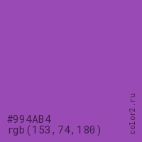 Цвет #994AB4 в цветовой модели RGB обозначается тремя октетами (153, 74, 180) в десятичном формате и #994AB4 в шестнадцатиричном (hex) формате, которые являются интенсивностью красного 153 (hex 99), интенсивность зелёного 74 (hex 4A) и интенсивность синего 180 (hex B4).