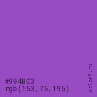 Цвет #994BC3 в цветовой модели RGB обозначается тремя октетами (153, 75, 195) в десятичном формате и #994BC3 в шестнадцатиричном (hex) формате, которые являются интенсивностью красного 153 (hex 99), интенсивность зелёного 75 (hex 4B) и интенсивность синего 195 (hex C3).