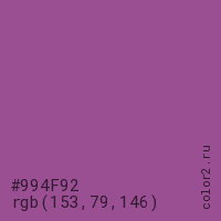 Цвет #994F92 в цветовой модели RGB обозначается тремя октетами (153, 79, 146) в десятичном формате и #994F92 в шестнадцатиричном (hex) формате, которые являются интенсивностью красного 153 (hex 99), интенсивность зелёного 79 (hex 4F) и интенсивность синего 146 (hex 92).