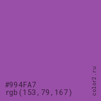 Цвет #994FA7 в цветовой модели RGB обозначается тремя октетами (153, 79, 167) в десятичном формате и #994FA7 в шестнадцатиричном (hex) формате, которые являются интенсивностью красного 153 (hex 99), интенсивность зелёного 79 (hex 4F) и интенсивность синего 167 (hex A7).