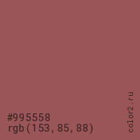 Цвет #995558 в цветовой модели RGB обозначается тремя октетами (153, 85, 88) в десятичном формате и #995558 в шестнадцатиричном (hex) формате, которые являются интенсивностью красного 153 (hex 99), интенсивность зелёного 85 (hex 55) и интенсивность синего 88 (hex 58).
