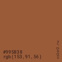 Цвет #995B38 в цветовой модели RGB обозначается тремя октетами (153, 91, 56) в десятичном формате и #995B38 в шестнадцатиричном (hex) формате, которые являются интенсивностью красного 153 (hex 99), интенсивность зелёного 91 (hex 5B) и интенсивность синего 56 (hex 38).