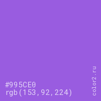 Цвет #995CE0 в цветовой модели RGB обозначается тремя октетами (153, 92, 224) в десятичном формате и #995CE0 в шестнадцатиричном (hex) формате, которые являются интенсивностью красного 153 (hex 99), интенсивность зелёного 92 (hex 5C) и интенсивность синего 224 (hex E0).