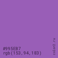 Цвет #995EB7 в цветовой модели RGB обозначается тремя октетами (153, 94, 183) в десятичном формате и #995EB7 в шестнадцатиричном (hex) формате, которые являются интенсивностью красного 153 (hex 99), интенсивность зелёного 94 (hex 5E) и интенсивность синего 183 (hex B7).