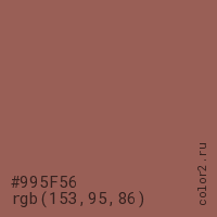 Цвет #995F56 в цветовой модели RGB обозначается тремя октетами (153, 95, 86) в десятичном формате и #995F56 в шестнадцатиричном (hex) формате, которые являются интенсивностью красного 153 (hex 99), интенсивность зелёного 95 (hex 5F) и интенсивность синего 86 (hex 56).