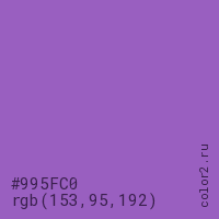 Цвет #995FC0 в цветовой модели RGB обозначается тремя октетами (153, 95, 192) в десятичном формате и #995FC0 в шестнадцатиричном (hex) формате, которые являются интенсивностью красного 153 (hex 99), интенсивность зелёного 95 (hex 5F) и интенсивность синего 192 (hex C0).