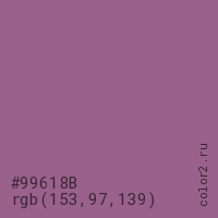 Цвет #99618B в цветовой модели RGB обозначается тремя октетами (153, 97, 139) в десятичном формате и #99618B в шестнадцатиричном (hex) формате, которые являются интенсивностью красного 153 (hex 99), интенсивность зелёного 97 (hex 61) и интенсивность синего 139 (hex 8B).