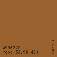 Цвет #99622E в цветовой модели RGB обозначается тремя октетами (153, 98, 46) в десятичном формате и #99622E в шестнадцатиричном (hex) формате, которые являются интенсивностью красного 153 (hex 99), интенсивность зелёного 98 (hex 62) и интенсивность синего 46 (hex 2E).