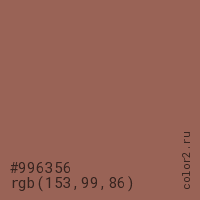Цвет #996356 в цветовой модели RGB обозначается тремя октетами (153, 99, 86) в десятичном формате и #996356 в шестнадцатиричном (hex) формате, которые являются интенсивностью красного 153 (hex 99), интенсивность зелёного 99 (hex 63) и интенсивность синего 86 (hex 56).