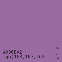 Цвет #996BA2 в цветовой модели RGB обозначается тремя октетами (153, 107, 162) в десятичном формате и #996BA2 в шестнадцатиричном (hex) формате, которые являются интенсивностью красного 153 (hex 99), интенсивность зелёного 107 (hex 6B) и интенсивность синего 162 (hex A2).