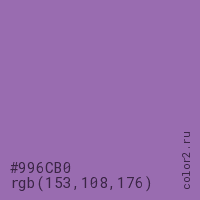 Цвет #996CB0 в цветовой модели RGB обозначается тремя октетами (153, 108, 176) в десятичном формате и #996CB0 в шестнадцатиричном (hex) формате, которые являются интенсивностью красного 153 (hex 99), интенсивность зелёного 108 (hex 6C) и интенсивность синего 176 (hex B0).