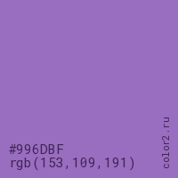 Цвет #996DBF в цветовой модели RGB обозначается тремя октетами (153, 109, 191) в десятичном формате и #996DBF в шестнадцатиричном (hex) формате, которые являются интенсивностью красного 153 (hex 99), интенсивность зелёного 109 (hex 6D) и интенсивность синего 191 (hex BF).
