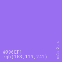 Цвет #996EF1 в цветовой модели RGB обозначается тремя октетами (153, 110, 241) в десятичном формате и #996EF1 в шестнадцатиричном (hex) формате, которые являются интенсивностью красного 153 (hex 99), интенсивность зелёного 110 (hex 6E) и интенсивность синего 241 (hex F1).