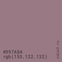 Цвет #997A84 в цветовой модели RGB обозначается тремя октетами (153, 122, 132) в десятичном формате и #997A84 в шестнадцатиричном (hex) формате, которые являются интенсивностью красного 153 (hex 99), интенсивность зелёного 122 (hex 7A) и интенсивность синего 132 (hex 84).