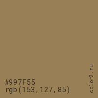 Цвет #997F55 в цветовой модели RGB обозначается тремя октетами (153, 127, 85) в десятичном формате и #997F55 в шестнадцатиричном (hex) формате, которые являются интенсивностью красного 153 (hex 99), интенсивность зелёного 127 (hex 7F) и интенсивность синего 85 (hex 55).