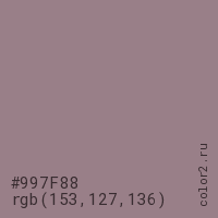 Цвет #997F88 в цветовой модели RGB обозначается тремя октетами (153, 127, 136) в десятичном формате и #997F88 в шестнадцатиричном (hex) формате, которые являются интенсивностью красного 153 (hex 99), интенсивность зелёного 127 (hex 7F) и интенсивность синего 136 (hex 88).