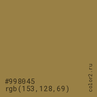 Цвет #998045 в цветовой модели RGB обозначается тремя октетами (153, 128, 69) в десятичном формате и #998045 в шестнадцатиричном (hex) формате, которые являются интенсивностью красного 153 (hex 99), интенсивность зелёного 128 (hex 80) и интенсивность синего 69 (hex 45).