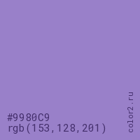 Цвет #9980C9 в цветовой модели RGB обозначается тремя октетами (153, 128, 201) в десятичном формате и #9980C9 в шестнадцатиричном (hex) формате, которые являются интенсивностью красного 153 (hex 99), интенсивность зелёного 128 (hex 80) и интенсивность синего 201 (hex C9).