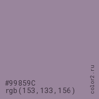 Цвет #99859C в цветовой модели RGB обозначается тремя октетами (153, 133, 156) в десятичном формате и #99859C в шестнадцатиричном (hex) формате, которые являются интенсивностью красного 153 (hex 99), интенсивность зелёного 133 (hex 85) и интенсивность синего 156 (hex 9C).
