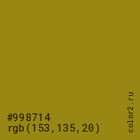 Цвет #998714 в цветовой модели RGB обозначается тремя октетами (153, 135, 20) в десятичном формате и #998714 в шестнадцатиричном (hex) формате, которые являются интенсивностью красного 153 (hex 99), интенсивность зелёного 135 (hex 87) и интенсивность синего 20 (hex 14).