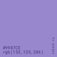 Цвет #9987CE в цветовой модели RGB обозначается тремя октетами (153, 135, 206) в десятичном формате и #9987CE в шестнадцатиричном (hex) формате, которые являются интенсивностью красного 153 (hex 99), интенсивность зелёного 135 (hex 87) и интенсивность синего 206 (hex CE).
