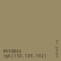 Цвет #998B66 в цветовой модели RGB обозначается тремя октетами (153, 139, 102) в десятичном формате и #998B66 в шестнадцатиричном (hex) формате, которые являются интенсивностью красного 153 (hex 99), интенсивность зелёного 139 (hex 8B) и интенсивность синего 102 (hex 66).