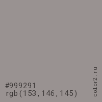 Цвет #999291 в цветовой модели RGB обозначается тремя октетами (153, 146, 145) в десятичном формате и #999291 в шестнадцатиричном (hex) формате, которые являются интенсивностью красного 153 (hex 99), интенсивность зелёного 146 (hex 92) и интенсивность синего 145 (hex 91).