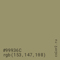 Цвет #99936C в цветовой модели RGB обозначается тремя октетами (153, 147, 108) в десятичном формате и #99936C в шестнадцатиричном (hex) формате, которые являются интенсивностью красного 153 (hex 99), интенсивность зелёного 147 (hex 93) и интенсивность синего 108 (hex 6C).