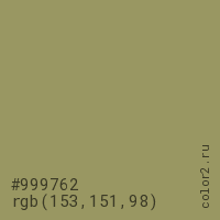 Цвет #999762 в цветовой модели RGB обозначается тремя октетами (153, 151, 98) в десятичном формате и #999762 в шестнадцатиричном (hex) формате, которые являются интенсивностью красного 153 (hex 99), интенсивность зелёного 151 (hex 97) и интенсивность синего 98 (hex 62).