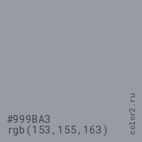 Цвет #999BA3 в цветовой модели RGB обозначается тремя октетами (153, 155, 163) в десятичном формате и #999BA3 в шестнадцатиричном (hex) формате, которые являются интенсивностью красного 153 (hex 99), интенсивность зелёного 155 (hex 9B) и интенсивность синего 163 (hex A3).