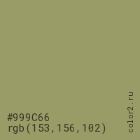 Цвет #999C66 в цветовой модели RGB обозначается тремя октетами (153, 156, 102) в десятичном формате и #999C66 в шестнадцатиричном (hex) формате, которые являются интенсивностью красного 153 (hex 99), интенсивность зелёного 156 (hex 9C) и интенсивность синего 102 (hex 66).