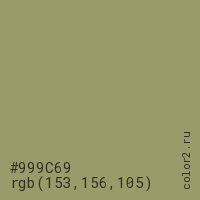 Цвет #999C69 в цветовой модели RGB обозначается тремя октетами (153, 156, 105) в десятичном формате и #999C69 в шестнадцатиричном (hex) формате, которые являются интенсивностью красного 153 (hex 99), интенсивность зелёного 156 (hex 9C) и интенсивность синего 105 (hex 69).