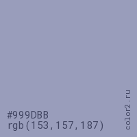 Цвет #999DBB в цветовой модели RGB обозначается тремя октетами (153, 157, 187) в десятичном формате и #999DBB в шестнадцатиричном (hex) формате, которые являются интенсивностью красного 153 (hex 99), интенсивность зелёного 157 (hex 9D) и интенсивность синего 187 (hex BB).