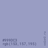 Цвет #999DC3 в цветовой модели RGB обозначается тремя октетами (153, 157, 195) в десятичном формате и #999DC3 в шестнадцатиричном (hex) формате, которые являются интенсивностью красного 153 (hex 99), интенсивность зелёного 157 (hex 9D) и интенсивность синего 195 (hex C3).