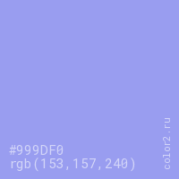 Цвет #999DF0 в цветовой модели RGB обозначается тремя октетами (153, 157, 240) в десятичном формате и #999DF0 в шестнадцатиричном (hex) формате, которые являются интенсивностью красного 153 (hex 99), интенсивность зелёного 157 (hex 9D) и интенсивность синего 240 (hex F0).