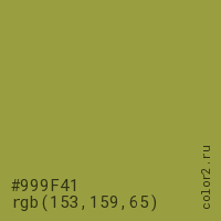 Цвет #999F41 в цветовой модели RGB обозначается тремя октетами (153, 159, 65) в десятичном формате и #999F41 в шестнадцатиричном (hex) формате, которые являются интенсивностью красного 153 (hex 99), интенсивность зелёного 159 (hex 9F) и интенсивность синего 65 (hex 41).