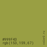 Цвет #999F43 в цветовой модели RGB обозначается тремя октетами (153, 159, 67) в десятичном формате и #999F43 в шестнадцатиричном (hex) формате, которые являются интенсивностью красного 153 (hex 99), интенсивность зелёного 159 (hex 9F) и интенсивность синего 67 (hex 43).