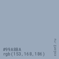 Цвет #99A8BA в цветовой модели RGB обозначается тремя октетами (153, 168, 186) в десятичном формате и #99A8BA в шестнадцатиричном (hex) формате, которые являются интенсивностью красного 153 (hex 99), интенсивность зелёного 168 (hex A8) и интенсивность синего 186 (hex BA).