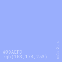Цвет #99AEFD в цветовой модели RGB обозначается тремя октетами (153, 174, 253) в десятичном формате и #99AEFD в шестнадцатиричном (hex) формате, которые являются интенсивностью красного 153 (hex 99), интенсивность зелёного 174 (hex AE) и интенсивность синего 253 (hex FD).