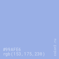Цвет #99AFE6 в цветовой модели RGB обозначается тремя октетами (153, 175, 230) в десятичном формате и #99AFE6 в шестнадцатиричном (hex) формате, которые являются интенсивностью красного 153 (hex 99), интенсивность зелёного 175 (hex AF) и интенсивность синего 230 (hex E6).