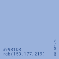 Цвет #99B1DB в цветовой модели RGB обозначается тремя октетами (153, 177, 219) в десятичном формате и #99B1DB в шестнадцатиричном (hex) формате, которые являются интенсивностью красного 153 (hex 99), интенсивность зелёного 177 (hex B1) и интенсивность синего 219 (hex DB).