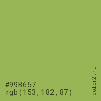 Цвет #99B657 в цветовой модели RGB обозначается тремя октетами (153, 182, 87) в десятичном формате и #99B657 в шестнадцатиричном (hex) формате, которые являются интенсивностью красного 153 (hex 99), интенсивность зелёного 182 (hex B6) и интенсивность синего 87 (hex 57).